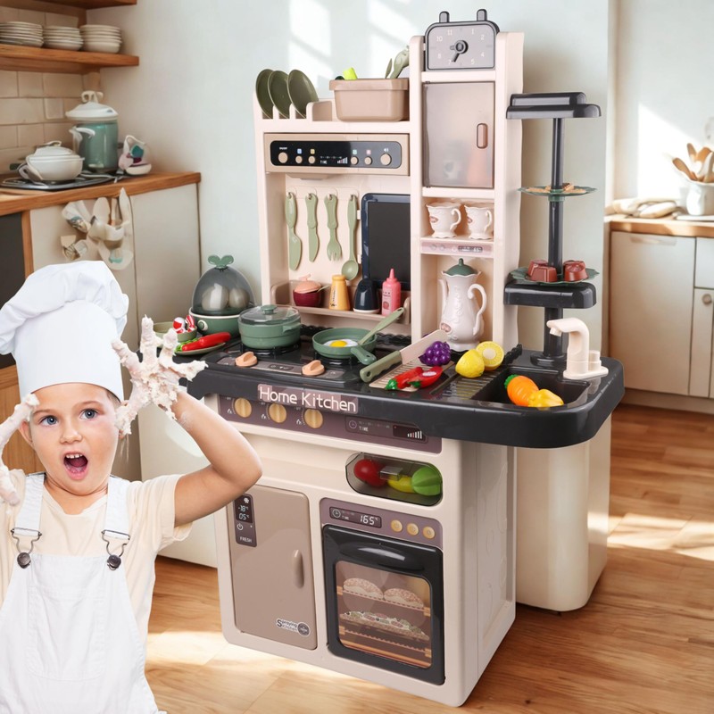 With 65 colorful accessories including pots, pans, cups, utensils, fruits, vegetables, and even a working egg steamer, kids can chop, stir, serve, and clean up like real cooks. The built-in drawing board is perfect for writing menus or recipes, encouraging creativity and communication. The set also features music, rotating steam functions, and a realistic design with detailed dials, storage baskets, and cabinets.