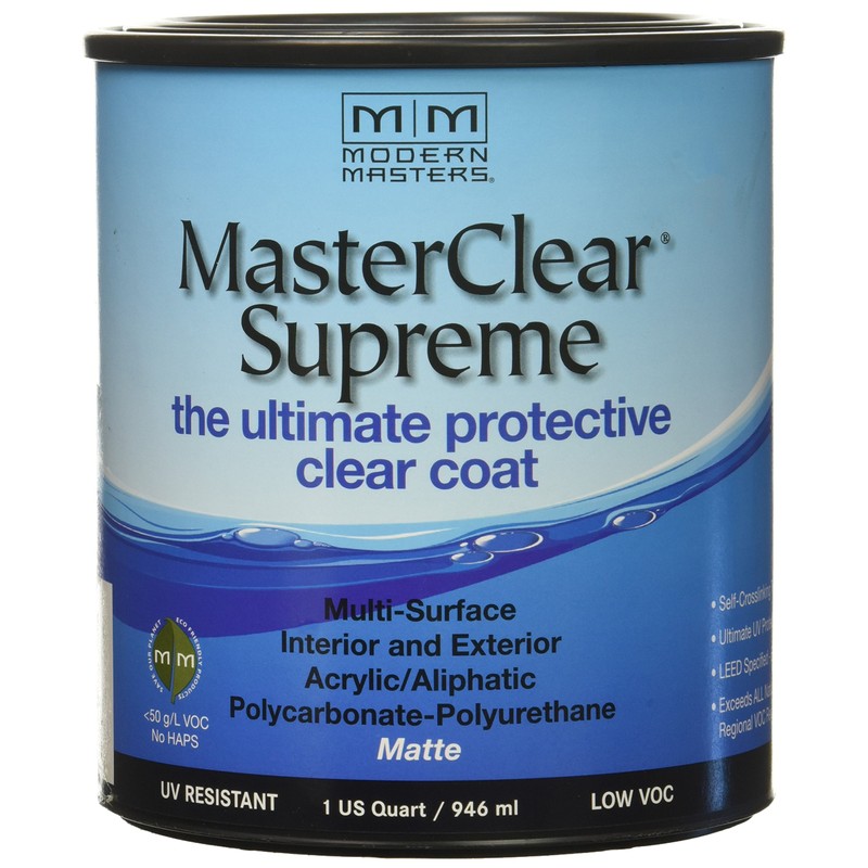Modern Masters MCS90132 MasterClear Supreme Protective Clear Matte Coat 1 Quart is non-yellowing, water based self-crosslinking acrylic aliphatic interior or exterior polyurethane topcoat. Dries quickly to a crystal clear finish. Protects exterior surfaces from oxidation, mildew, bird droppings and has UV blockers and absorbers. Matte sheen.