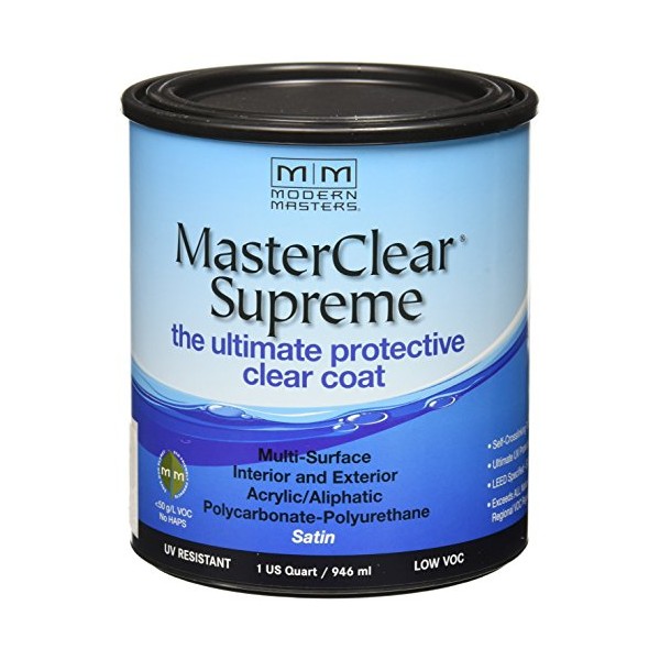 Modern Masters MCS90232 MasterClear Supreme Protective Clear Satin Coat 1 Quart is non-yellowing, water based self-crosslinking acrylic aliphatic interior or exterior polyurethane topcoat. Dries quickly to a crystal clear finish. Protects exterior surfaces from oxidation, mildew, bird droppings and has UV blockers and absorbers. Satin finish.