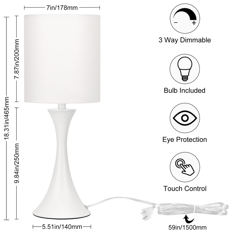 - 3-way Dimmable & Touch Control: Just need to tap the lamp base with your finger, you could change the light brightness on 3 stage (Low, Medium,High) conveniently. No need to get up in the middle of the night to search for a small switch any more, this white table lamp would let you catch up on your sleep easier and cosier.