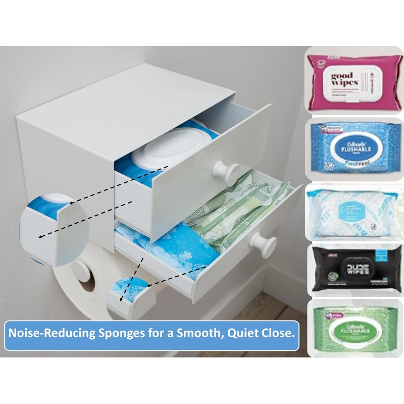 Modern Toilet Paper Holder with Storage Drawers - Toilet Paper and Wipes Holder for Bathroom - Aluminum TP Holder with Shelf and Drawers - Adhesive or Wall Screw Mounting - Withe/White Knobs