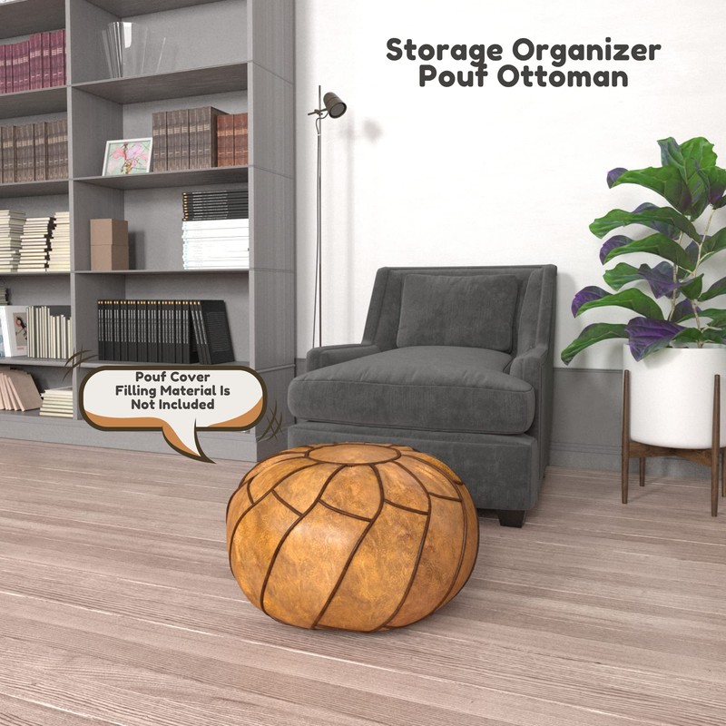 Moderner Faux Leather Pouf Unstuffed Ottoman Moroccan Footstool, Floor Footrest Cushion, Storage Solution - Natural Brown Color (Camel, 23x11)