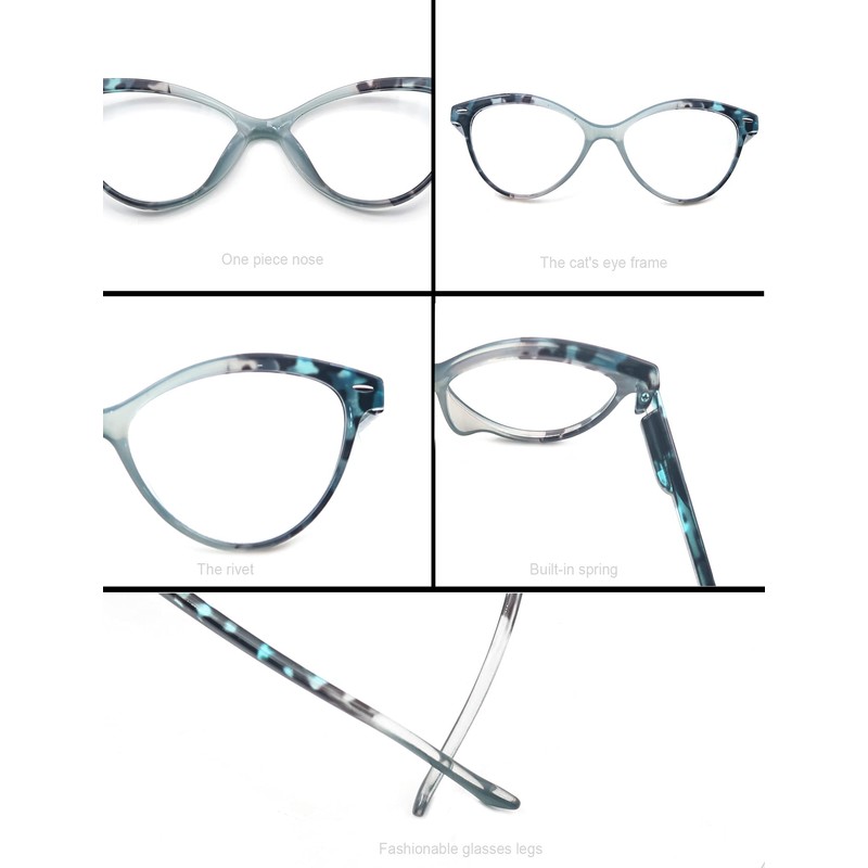 - Cateye Reading Glasses: Lightweight frames and plastic lenses with flexible spring hinge temples ensure a comfortable fit without uncomfortable pinching,clear vision,they really work well when you can't read those fine prints on newspaper etc.Each pair of readers glasses is carefully selected to ensure quality