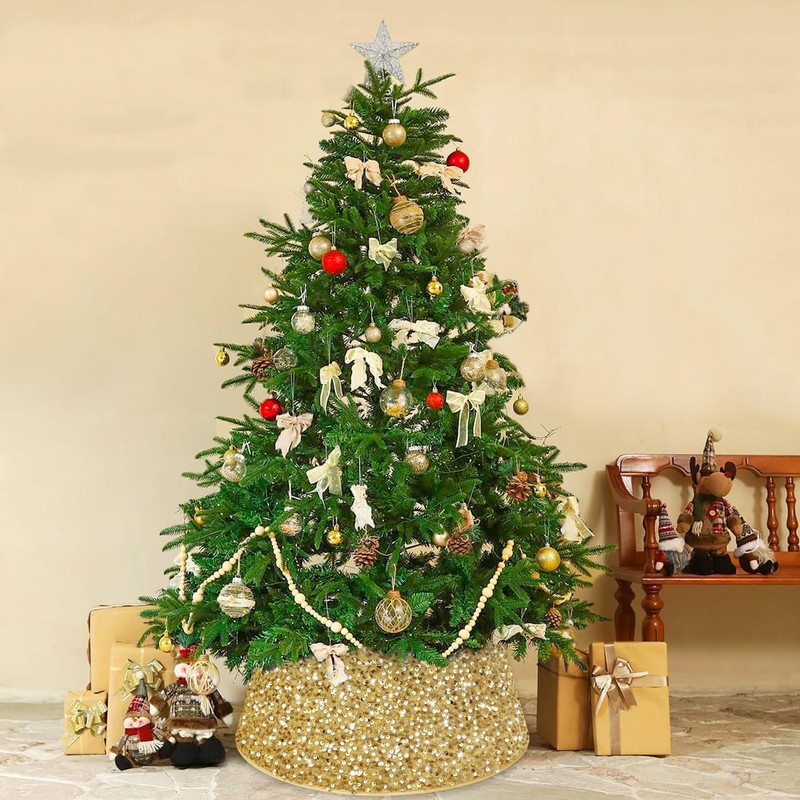 - 【Size Detail - Gold Tree Collar】You will receive a gold sequins tree collar, measure approximately 28.8 inch diameter at the bottom base, and 22 inch diameter on the top. You can put some gifts, Christmas boxes, christmas ball on the xmas tree base. The Christmas tree stand collar is perfect for decorating your home and become part of your holiday tradition.
