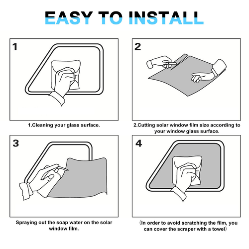 - Pick up your film and apply to your window(Please MAKE SURE you have removed it before you apply the window film to glass). The soapy water solution on the film and the glass will allow you to slide it into correct position.