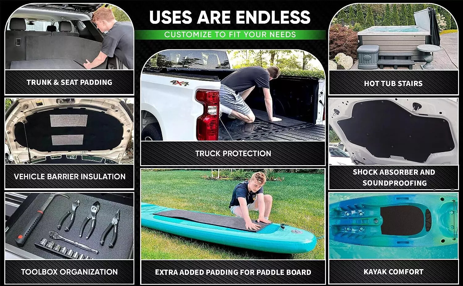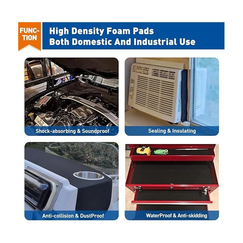 Closed foam padding is made of EPDM, this material is specifically made and designed to cushioning,sealing,shock absorption,sound insulation,sound reduction and noise reduction,which can be used in high traffic areas such as auto, garage, and kitchen areas.