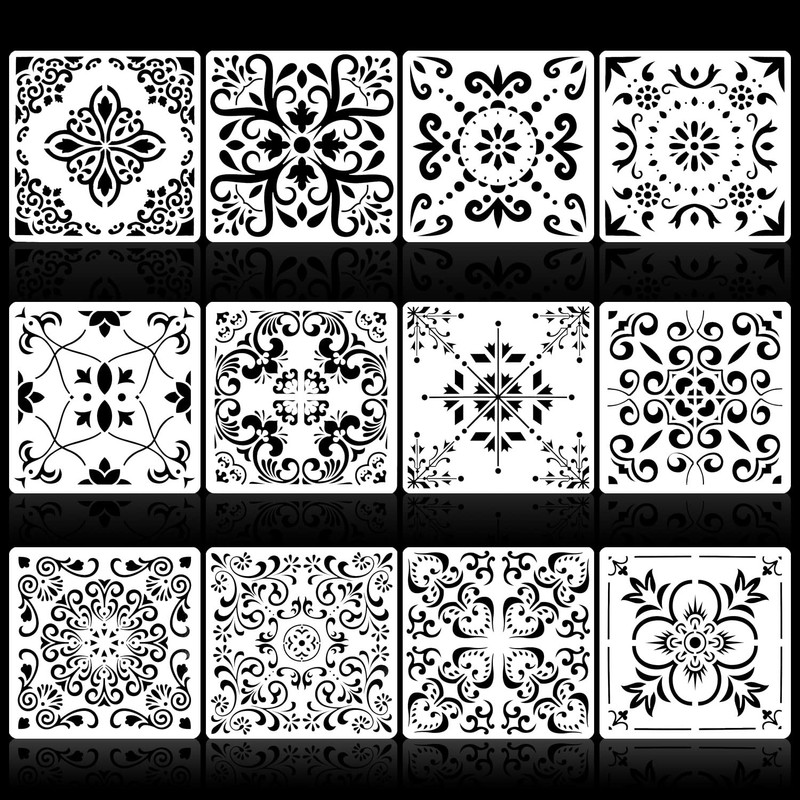 Modixun Tile Stencils Large 30x30cm Reusable Floor Stencils with Round Edges Painting Stencils for Wall, Wood, Furniture, Style A 12pcs
