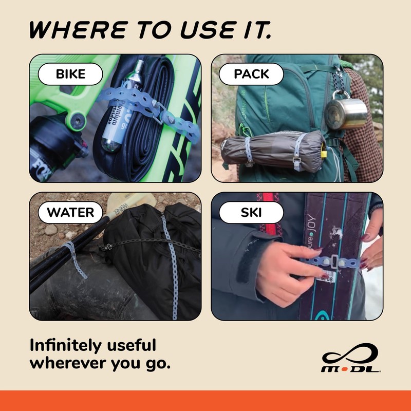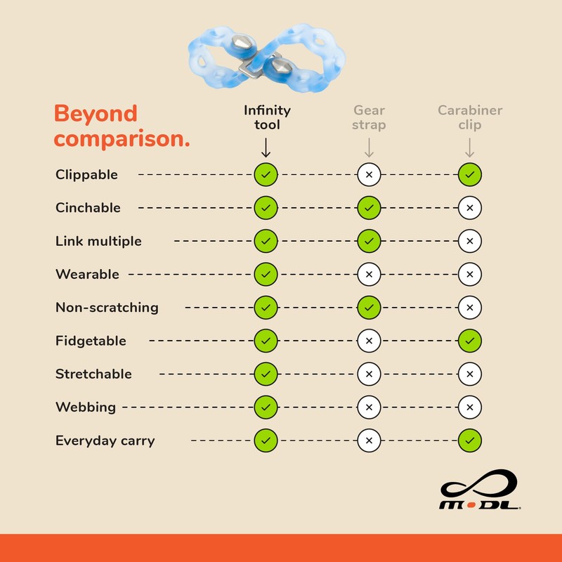 - COMPATIBLE with MOLLE, D-rings, carabiners, key rings, backpacks, and many other types of gear and attachment points. Get creative and see what you can do with the Infinity Tool!