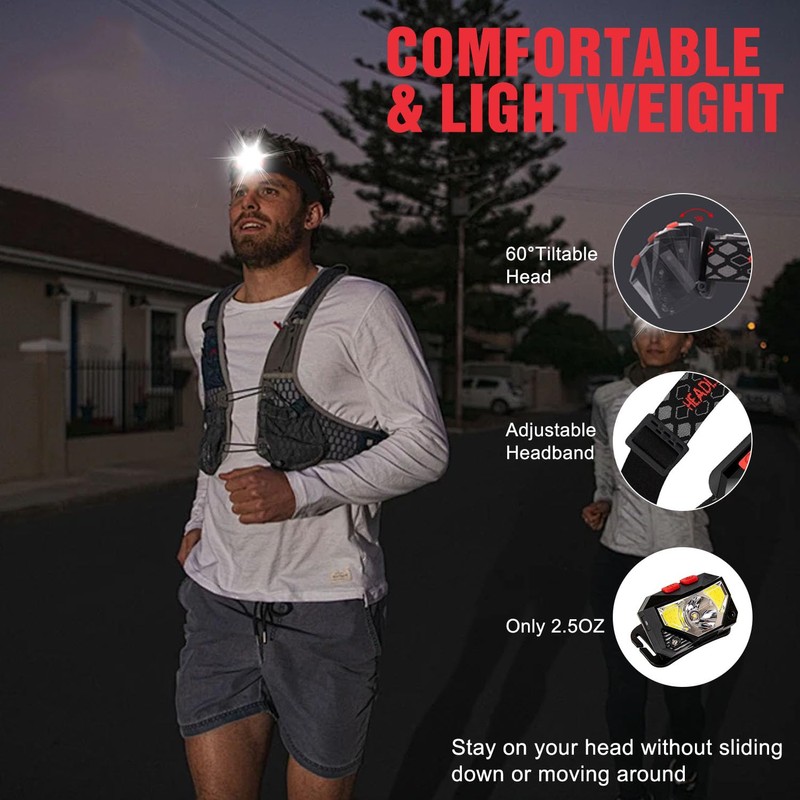 - Ultra-light and Adjustable: The hand-free headlamp is only weight 0.15BL, comfortable and lightweight. The lamp head can be rotated 60° perform multi-directional illuminationand tightly fixed to avoid shaking and sliding when running.