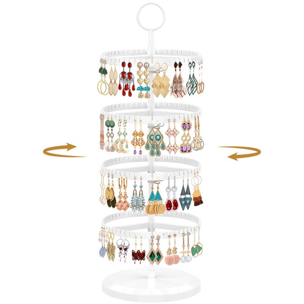 MODOWEY 4 Tier Rotating Earring Holder Organizer, Adjustable Metal & Plastic Stand Tree with 228 Grooves for Stud Hoop Pierced Dangle Display, Decluttered & Space-Saving Storage Rack for Women, White