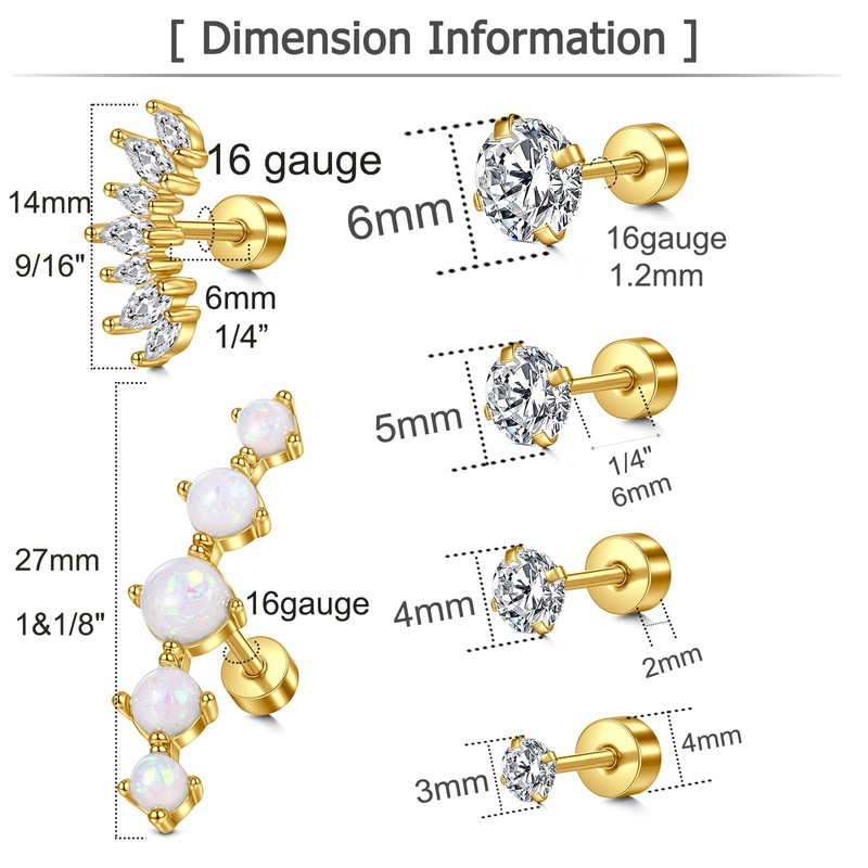 - [Measurements]: flat back stud earrings cartilage piercing jewelry thickness 16 gauge (1.2mm), gold cartilage earring pole length: 1/4"(6mm), flat back stud earrings top jewelry size: 3mm, 4mm, 5mm, 6mm; flat back stud earrings screw backs : 3mm;