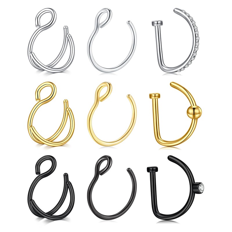 - [Item Contain]: 9pcs fake nose ring (fake lip ring, fake earring hoop, clip on earring hoop, fake double hoop nose ring)