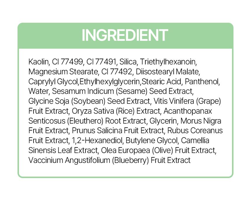 - Ingredients: Iron Oxide Black,Kaolin,Silica,Triethylhexanoin,Magnesium Stearate,Iron Oxide Red,Iron Oxide Yellow,Diisostearyl Malate,Caprylyl Glycol,Ethylhexylglycerin,Stearic Acid,Panthenol,Water,Sesamum Indicum (Sesame) Seed Extract,Glycine Max (Soybean) Seed Extract,Vitis Vinifera (Grape) Fruit Extract,Oryza Sativa (Rice) Extract,Acanthopanax Senticosus (Eleuthero) Root Extract,Glycerin,Morus Nigra Fruit Extract, Prunus Salicina Fruit Extract,Rubus Coreanus Fruit Extract,1,2-Hexanediol,Butylene Glycol,Camellia Sinensis Leaf Extract,Olea Europaea (Olive) Extract,Vaccinium Angustifolium (Blueberry) Fruit Extract