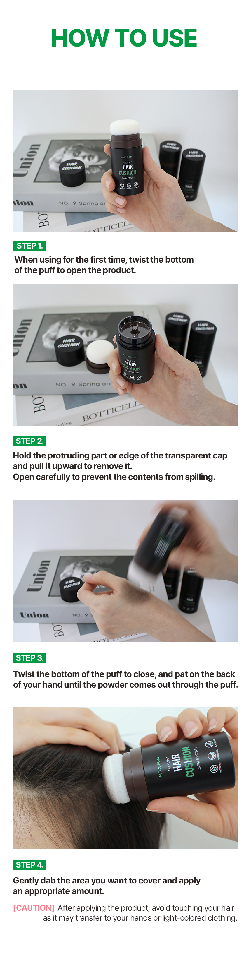 1. When using it for the first time, open the product by turning the bottom of the puff. 2. Pull up the central protrusion or edge of the transparent cap to remove it. Please open it carefully as the contents may spill if pulled forcibly. 3. Close the bottom of the puff by turning it and pat it on the back of your hand until the powder comes out through the puff. 4. Tap-tap on the area you want to cover to apply an appropriate amount.