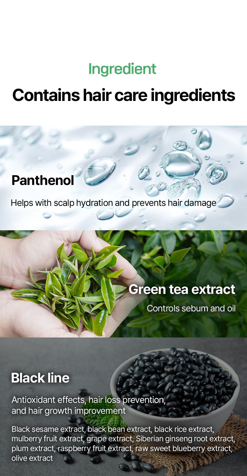 It contains panthenol, which helps moisturize the scalp and avoid hair damage. It contains Camellia Sinensis Leaf Extract, which helps control oil and sebum. It contains black line, which has antioxidant effects and helps avoid and improve hair loss.