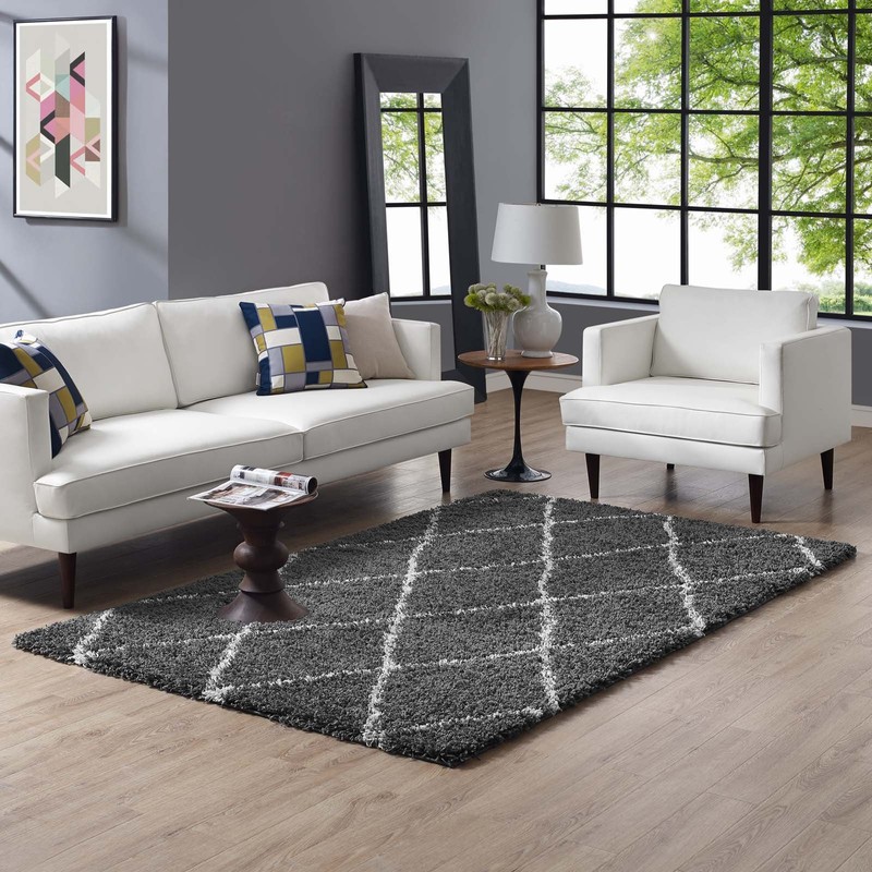 Modway Toryn Diamond Trellis 5x8 High Pile Shag Area Rug With Lattice Design In Dark Gray and Ivory