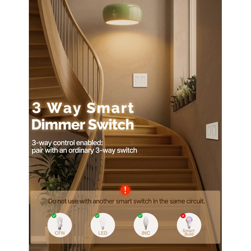 - 【Important Notes Before Purchase】Supports 2.4GHz WiFi only (not 5GHz). Compatible with dimmable but non-smart bulbs. The other end must use a traditional 3-way switch. Standard wall plate and screwless faceplate included.