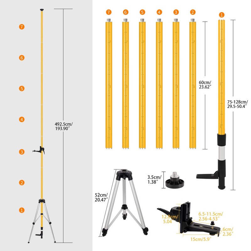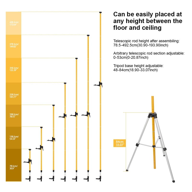 - Adjustable Laser Pole with Tripod: The MOETER 15.7 Ft laser level pole is a versatile 4-in-1 tool featuring a tripod and a multipurpose mounting clamp. The extendable mounting pole allows you to securely hold your laser unit from floor to ceiling with ease. It includes four telescopic rods and one tail rod, achieving a maximum height of 15.7 ft. The graduations are clearly marked in black on the yellow pole in both inches and centimeters for easy reading.