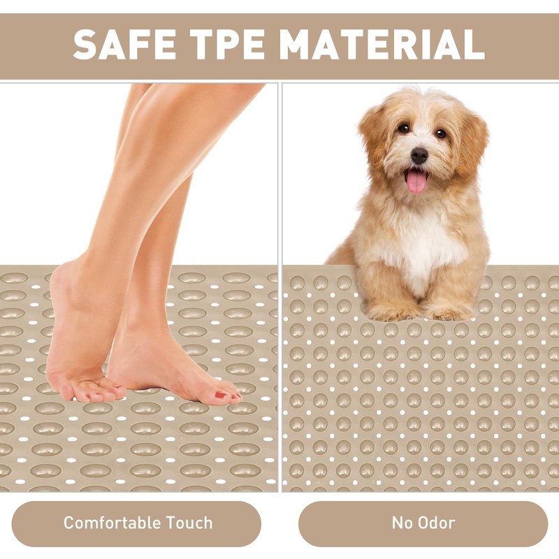 • TPE MATERIAL: Unlike other stiff shower mat, our non slip shower mat is made of premium TPE material, which is super soft, comfortable and odorless. The raised dots on the surface of the shower matt can also gently massage your feet, bringing a pleasant shower experience