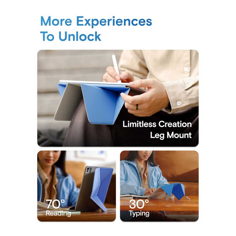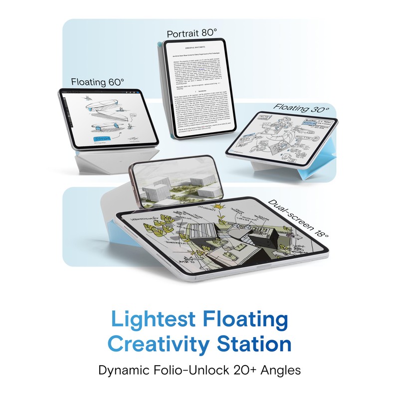 - Ultimate Ergonomic Floating Modes - MOFT Dynamic Folio Case makes iPad ergonomics effortless for mobile creativity - featuring a single-piece structure that effortlessly folds into a workstation lifting iPads up 2-inches. Frictionless angle shifts between 30 and 60 keep you aligned in your input-output framework.