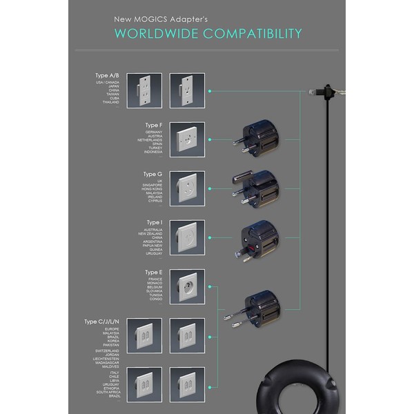 Super Bagel is the latest model of MOGICS Power Bagel that supports 7 charging ports ( 5 AC sockets, 2 USBs) : Universal(US/EU/UK/AU) types of AC sockets x 4 and US type x1 AC Sockets, and USBs. The main differences with previous models: The 2 USB ports support Type C and USB A- 18W (9V2A) or 20W share(5V2A x 2); 7A Auto Reset fuse; New MA1(MOGICS mini adapter)... The items in package include: Main Super Bagel x1, new MA1 x1, new Case x1, User Guide x1). 2 color's options of main device in black/ white. The Cable Lenght: 92cm; Φ:83mm; H:31mm; Weight:118g