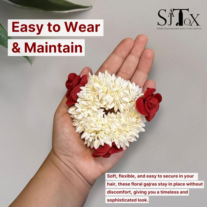 Mogra Gajra Scented 6pcs Artificial Flower Hair Accessories Scrunchies with Red Petals Bracelet Bun Juda & Ponytail Wedding Jewellery Reusable Gajras Gift for Women (White,Red)