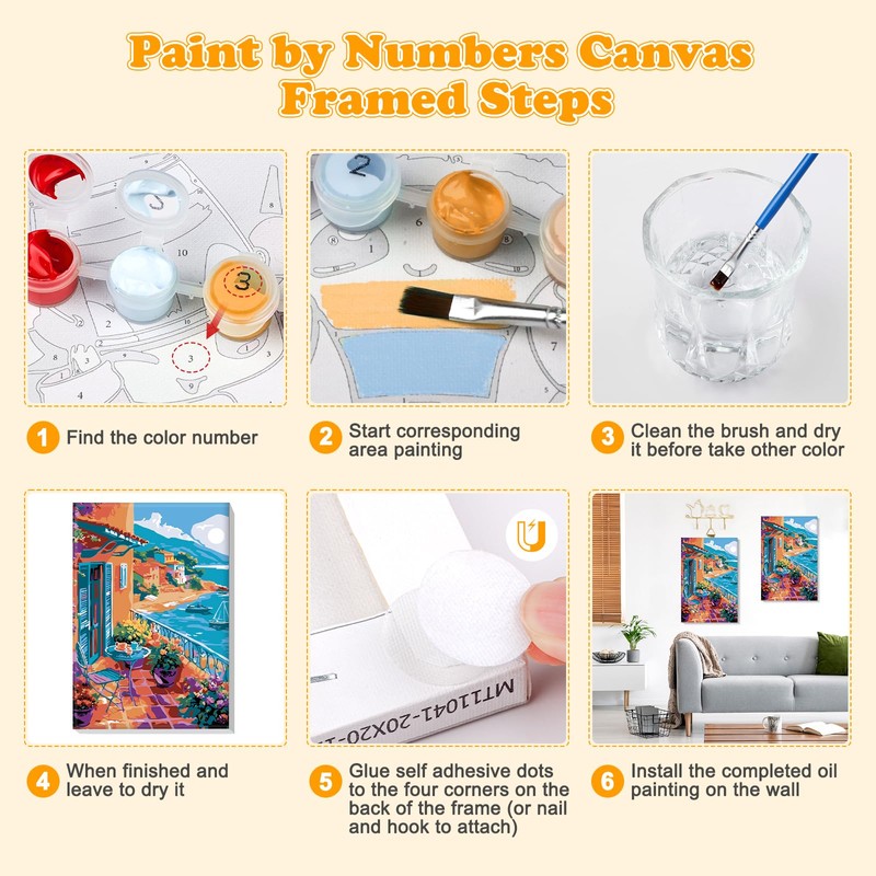 - 🎉【DIY Steps】Firstly, find the color number on canvas and start painting. Secondly, clean the brush and dry it before take other color. Thirdly, leave to dry it and apply the sticker to the four sides to the back frame, and finally show your masterpiece