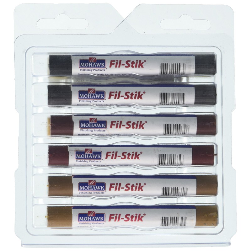 Fil-stik repair pencils, 12 pk, from mohawk are semi-hard putty sticks used to fill in nicks and scratches or open corner joints. The fill can be protected with Tone finish aerosols or other coatings. No heat or special tools required—simply rub in and wipe off.