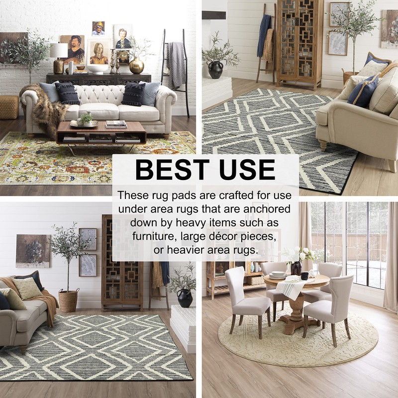 - RECOMMENDED USE: This FELT ONLY rug pad is not intended to stop area rugs from slipping. These rug pads are crafted for use under area rugs that are anchored down by heavy items such as furniture, large household décor pieces, or heavier area rugs.