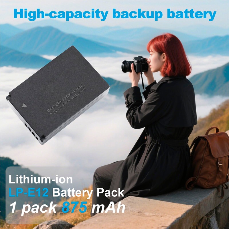 Rechargeable lithium-ion battery LP-E12, 7.2V 875mAh high capacity battery pack, designed for Canon cameras, perfect replacement for the original battery. Adopting high energy density cell, no memory effect, support 500 times cycle charging, long-lasting life. Seamless match with original charger. Lightweight design, 30% longer battery life, meet the needs of long time outdoor shooting, travel vlogging, etc., say goodbye to the trouble of frequent battery replacement. Built-in overcharge/short circuit protection chip, CE/FCC certified, safe and durable. Suitable for photography enthusiasts, self media creators, provide stable power for your camera, capture every moment of excitement.