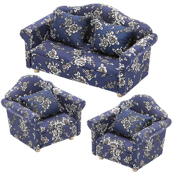 moin moin 2306mini16 Miniature 1/12 Scale Furniture Sofa Set of 3 B Goods Translation Ant/Dollhouse 2 Seater Single Cushion White Floral Flower Blue Blue Cloth Fabric Doll Doll Miscellaneous Goods