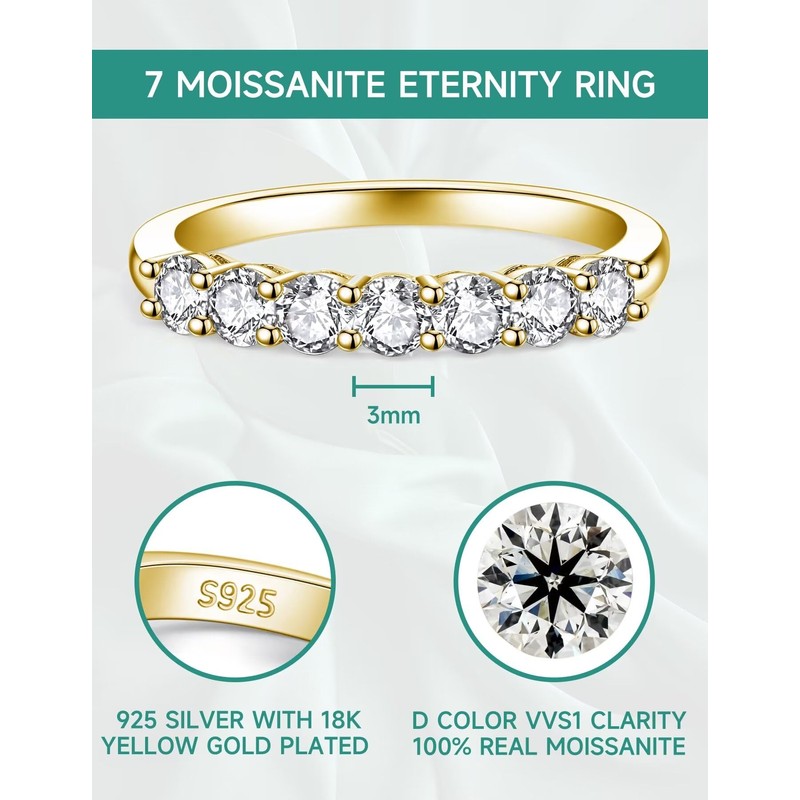 Moissanite Cottage 7 Stones Moissanite Anniversary Rings for Women, 0.7 Carat Round Cut Diamond 18K White Gold Plated 925 Sterling Silver Half Eternity Wedding Bands Stackable Ring, 8, Metal,, Yellow