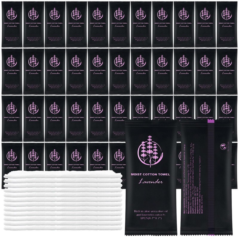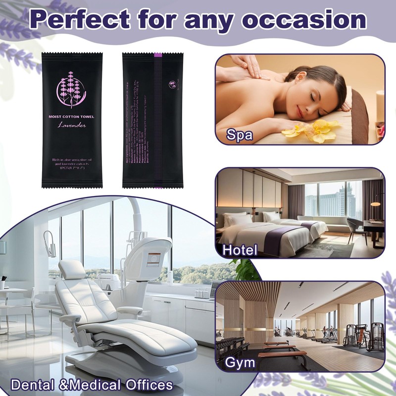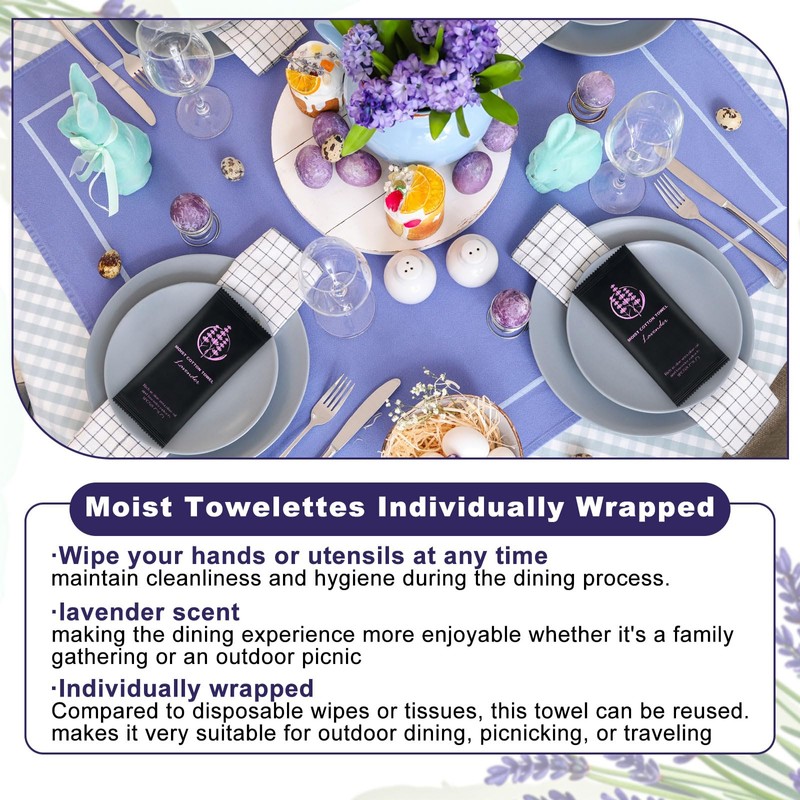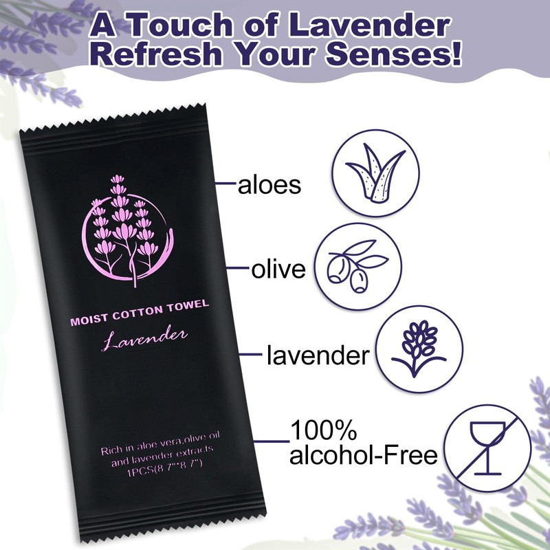 Moist Cotton Towel Bulk Moist Towelettes Individually Wrapped,White Towel Services,Refreshment Pre Moistened Towels for Dentist Travel Sport Party Hotel (Lavender,100)
