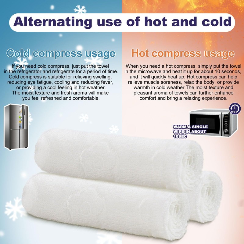 - 3.Hot or cold compress: these scented towelettes individually wrapped can be used hot or cold, and can be heated in the microwave for about 10 to 12 seconds. a soothing warm compress can relax tense muscles. these scented moist towels can also be used as cold compresses; chill them in the refrigerator for a refreshing cold compress on your skin.