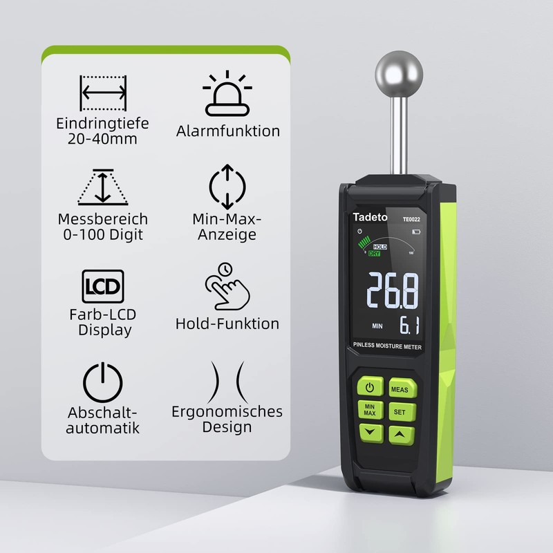 • 3 inch HD colour screen: moisture meter with large, backlit 3-inch LCD colour screen and 3-colour histogram with the states "dry", "dangerous" and "wet" in the colours "green," "yellow" and "red", allows a clear reading of readings from all angles with HOLD function, max/min display, automatic shut-off function, opp T1111 and Arms (alarm range can be set manually)