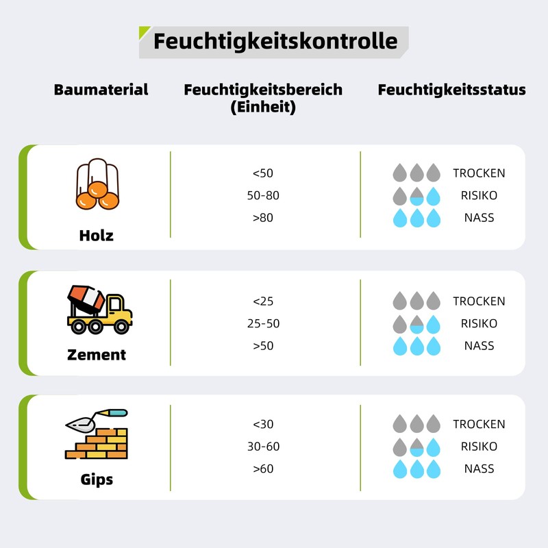 • Accurate and non-destructive measurement: the moisture meter has a high-precision alloy probe and a powerful processing chip for accurate measurements without damaging the material surface, an extended handle and a probe to cover a variety of narrow and difficult areas, a measuring depth of up to 40 mm, a range of 0-100 and a resolution of 0.1.