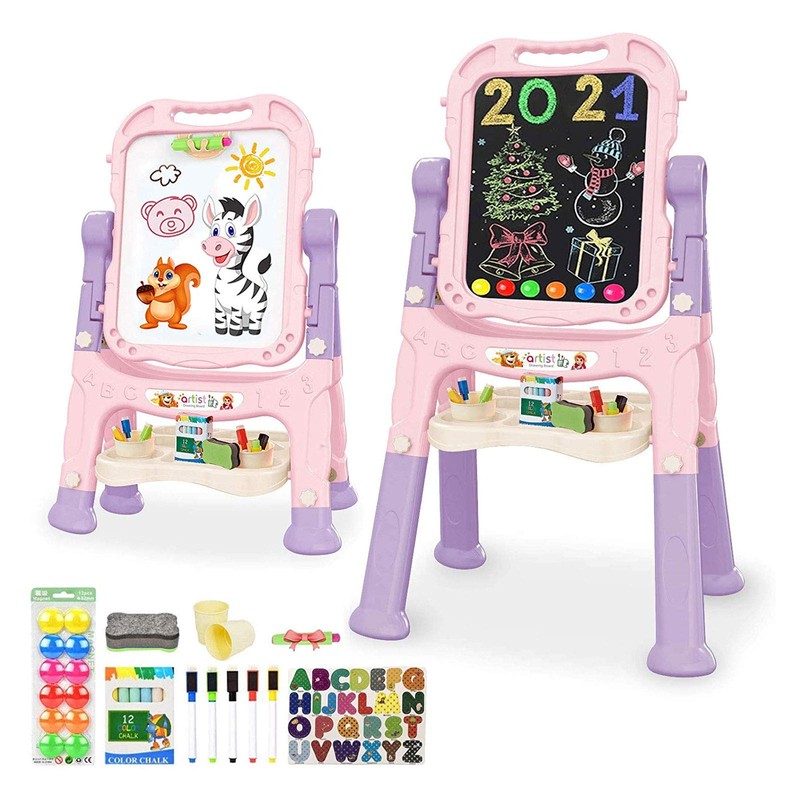 Mojitodon Art Easel for Kids, Adjustable Standing Rotatable Double Sided Easel with Painting Accessories for Toddlers Boys and Girls-Pink
