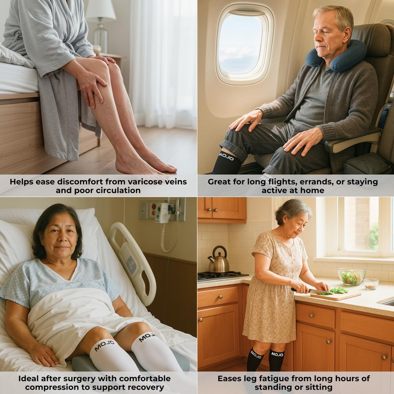 - SUPPORT FOR TRAVEL, DAILY WEAR & RECOVERY. Whether at home, on your feet, or in transit, these socks help prevent blood pooling and leg discomfort during prolonged periods of inactivity—perfect for older adults with circulation concerns.