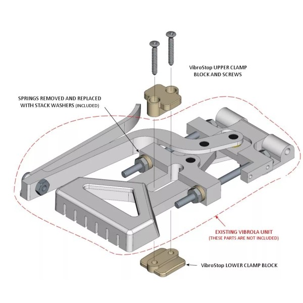 The VibroStop Kit includes two nickel-plated CNC machined brass clamp blocks and necessary fasteners. The clamp blocks replace the stock bearing block which is located in the center of the Vibrola unit. The clamp blocks are fastened to the body with two wood screws which are threaded into the existing holes. Installation instructions are included. It’s very simple to install and can be done in about 10-15 minutes. The VibroStop Kit was designed with several goals in mind:
