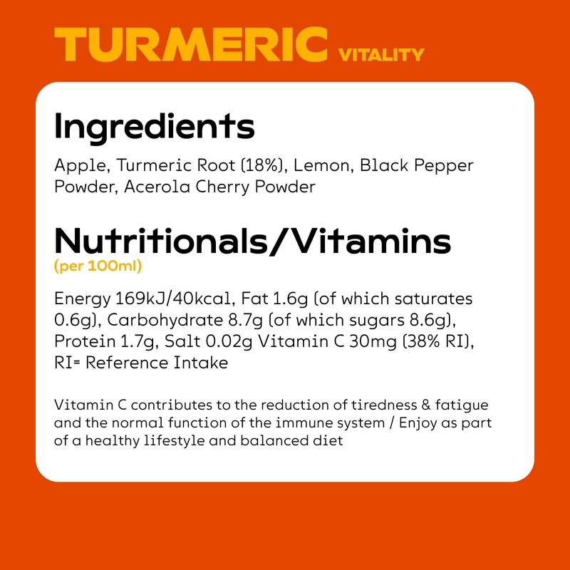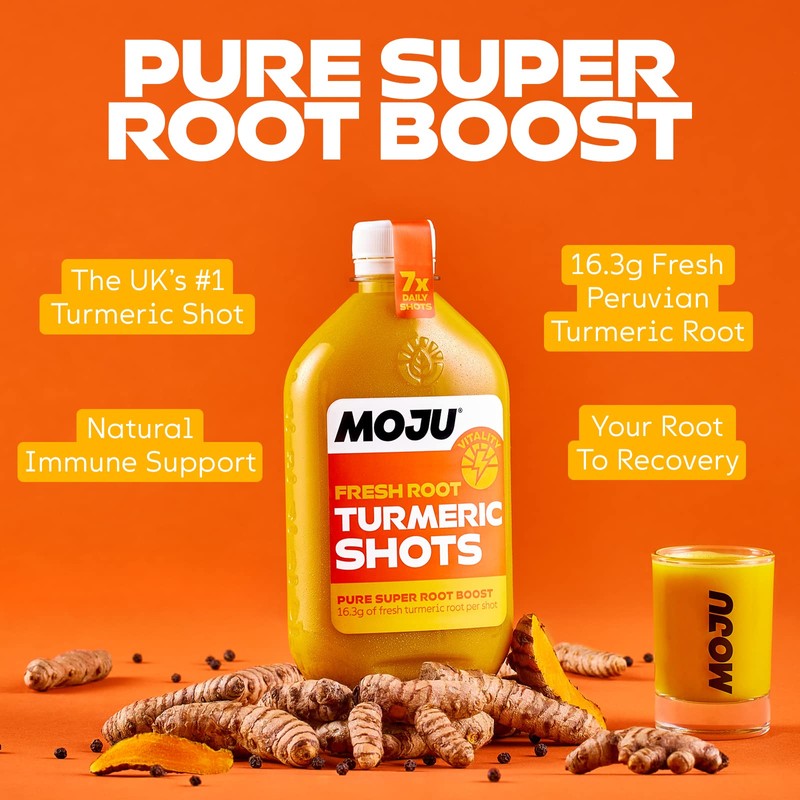 - FRESH PRESSED PERUVIAN TURMERIC - With 16.3g of the highest quality raw, fresh-pressed Peruvian turmeric root in every shot for a daily boost or to aid recovery. The MOJU turmeric shot also contains black pepper to help your body absorb the good stuff. Turmeric's active ingredient curcumin has been found to help joint health and inflammation. Turmeric is also packed with iron, potassium and vitamin B1, with evidence suggesting strong benefits to the gut microbiome.