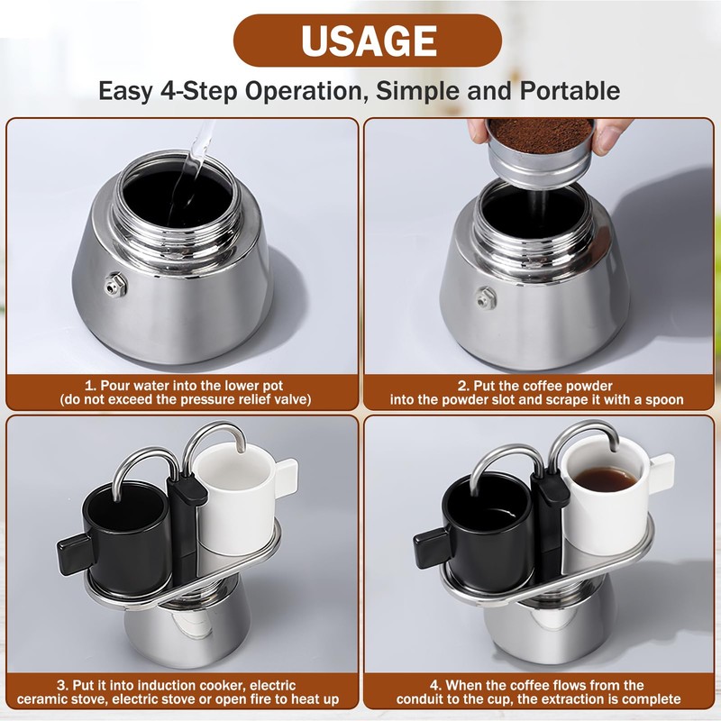 - EASY TO USE: The Coffee pot can be easily placed on stove top to brew the best-tasting coffee in minutes. Simply fill the boiler with water, add coffee to the basket, screw on the top tightly, and heat