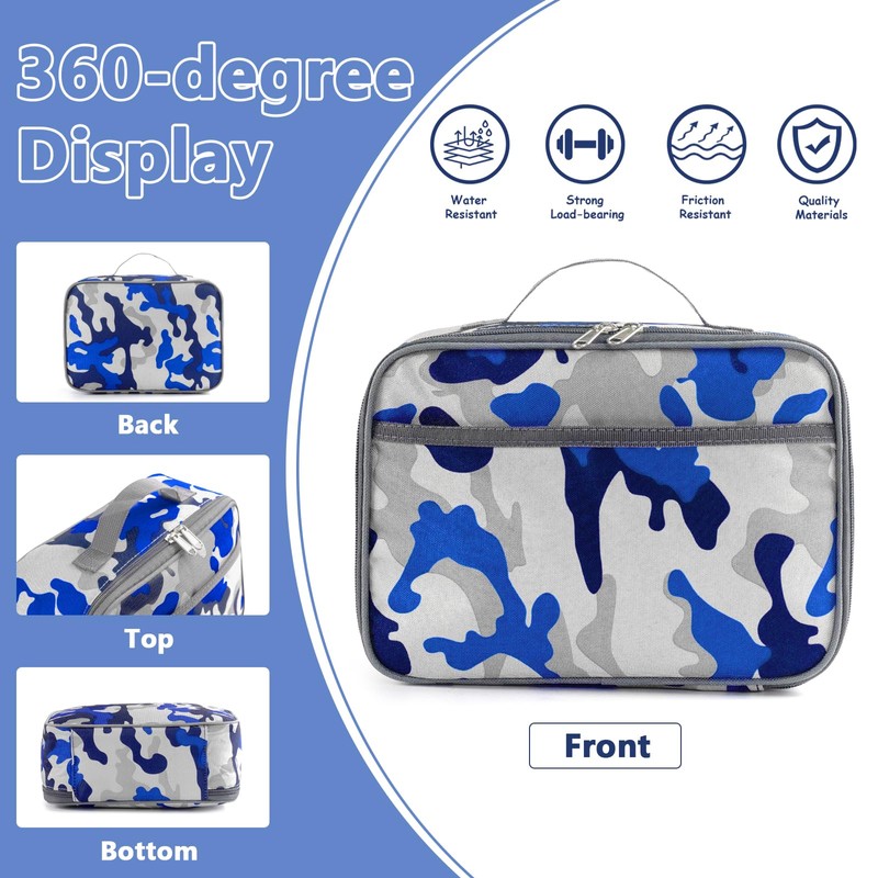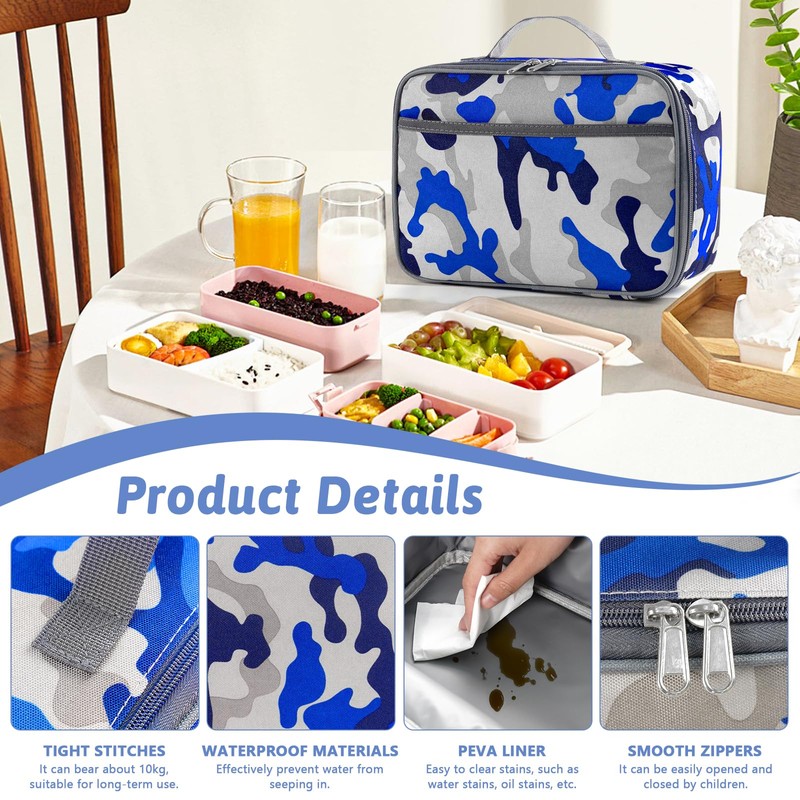 • 【Permium Materials】The outer fabric of the kids lunch bag is high-quality 600D Oxford fabric, which is water resistant and friction-resistant and can be washed by hand. The inner fabric is PEVA, which is very easy to clean when it is stained by food, water, oil, etc.