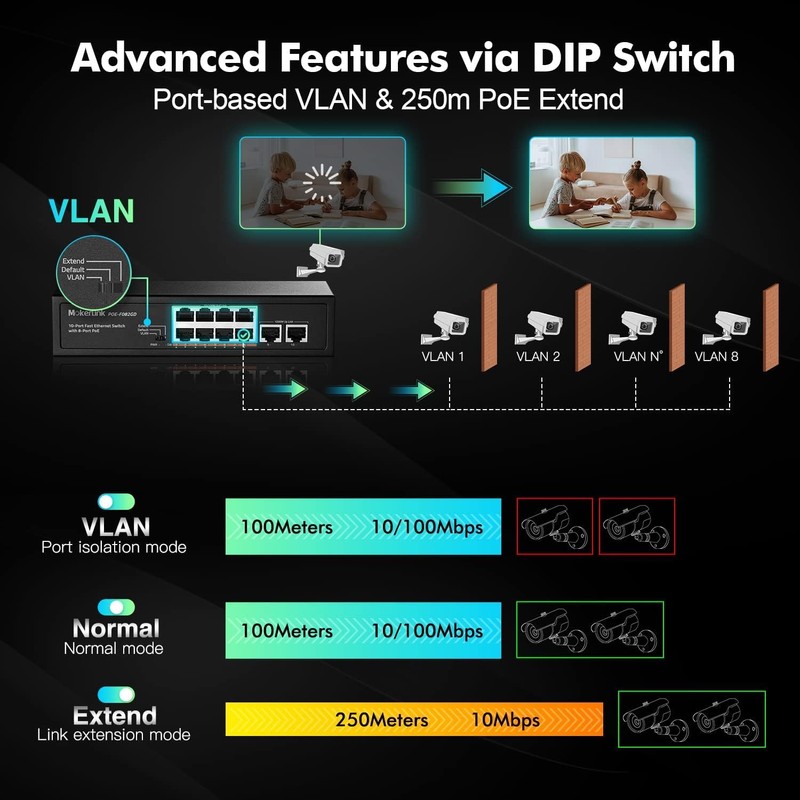 - Vlan & Extend: When turn on the extend mode, the POE port can be extended to 250 meter distances and 10Mbps speed; Support Vlan isolation, ports are isolated from each other, only communicate with the uplink port, improve the network safety.