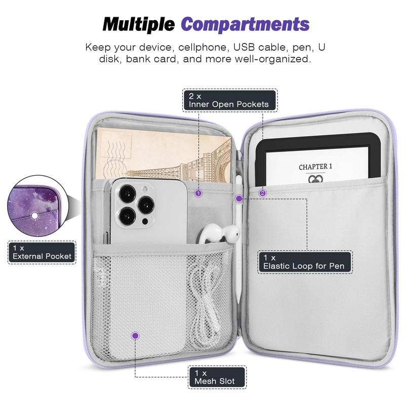 - [Convenient Storage] - The main compartment can store ereader devices. The other two side inner pockets are suitable for storing e-readers, mobile power, chargers, pens, earphones, cables, etc., with an elastic pen loop in the middle. The outer pocket can hold notepads, documents etc. Made from well-made double zip, durable and smooth.