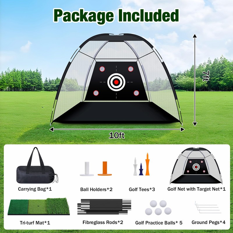 Package Includes: Golf Net*1, Target Net*1, Tri-Turf Mat*1, Fibreglass Rods*2, Balls*5, Ball Holders*10, Ground Pegs*4 and Golf Bag*1.