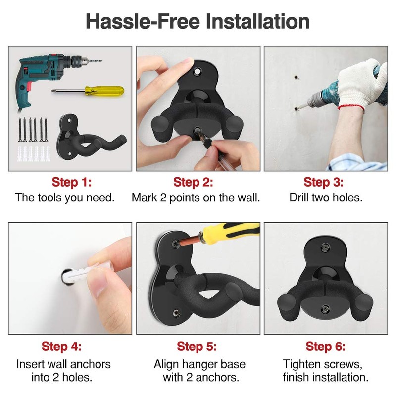 - Easy Install: Packaged with 6 screws and 6 wall anchor. By using the attached screws and wall anchor, you can easily install the guitar hook stand in minutes.