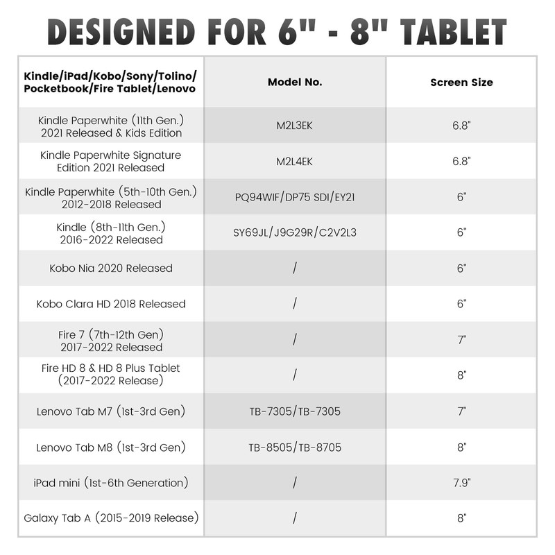 Fire Tablet/Kindle/Kobo Nia/Kobo Clara HD/Lenovo tab M7/tab M8/Voyaga/Sony/Tolino tablet.
