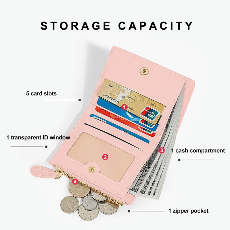 - Storage Capacity: The card holder wallet for women has 5 card slots, 1 transparent ID window, 1 cash compartment, 1 zipper pocket, enough to meet your daily essentials, such as credit cards, bank cards, ID card, cash, coins, changes, photos, and so on