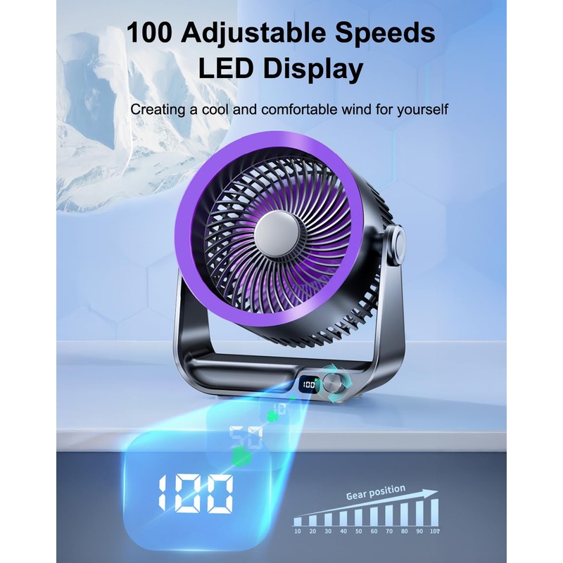 Mokren Desk Fan for Bedroom Table Fan small Quiet Digital Display for Office, Bedroom, Kitchen, Home, Outdoor, Powerful 100 Adjustable Speeds Air Circulator Fan, 105° Tilt Travel Camping Fan, Purple