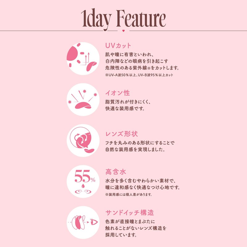 - [LENS FEATURE]・【UVカット】肌や瞳に有害といわれ、白内障などの眼病を引き起こす危険性のある紫外線をカットします ※UV-A波50%以上、UV-B波95%以上カット・【イオン性】脂質汚れが付きにくく、快適な装用感です。・【レンズ形状】フチを丸みのある形状にすることで自然な装用感を実現しました。・【高含水】水分を多く含む柔らかい素材で、瞳に違和感なく快適な着け心地です。 ※装用感には個人差があります。・【サンドイッチ構造】色素が直接瞳とまぶたに触れることがないレンズ構造を採用しています。